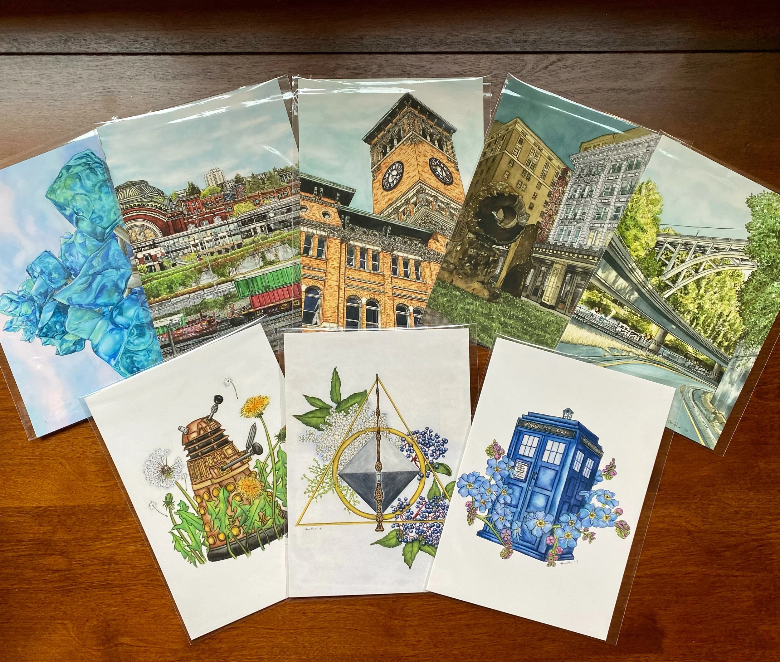 Hello! I’m an Ink and Watercolor artist based in Tacoma, WA. I’m a proud mom of four who decided to turn my favorite hobbies into something more. Creating has been part of my life for as long as I can remember. I grew up expressing myself through art and music and was lucky enough to be selected as a member of the inaugural class of my local Art High School. It wasn’t until after high school, however, that I found my way to Ink & Watercolor; and it feels just right! I love creating art that inspires joy, nostalgia, and the feeling of home. As a life long Tacoman, I have been thrilled to be able to share what makes me feel at home with a wider audience through my Grit City, Tacoma series. I also love touching on the joy many of us share through fandoms, fables, nature, and more. I make art that makes me happy, and I love when I get to see someone else connect to it.